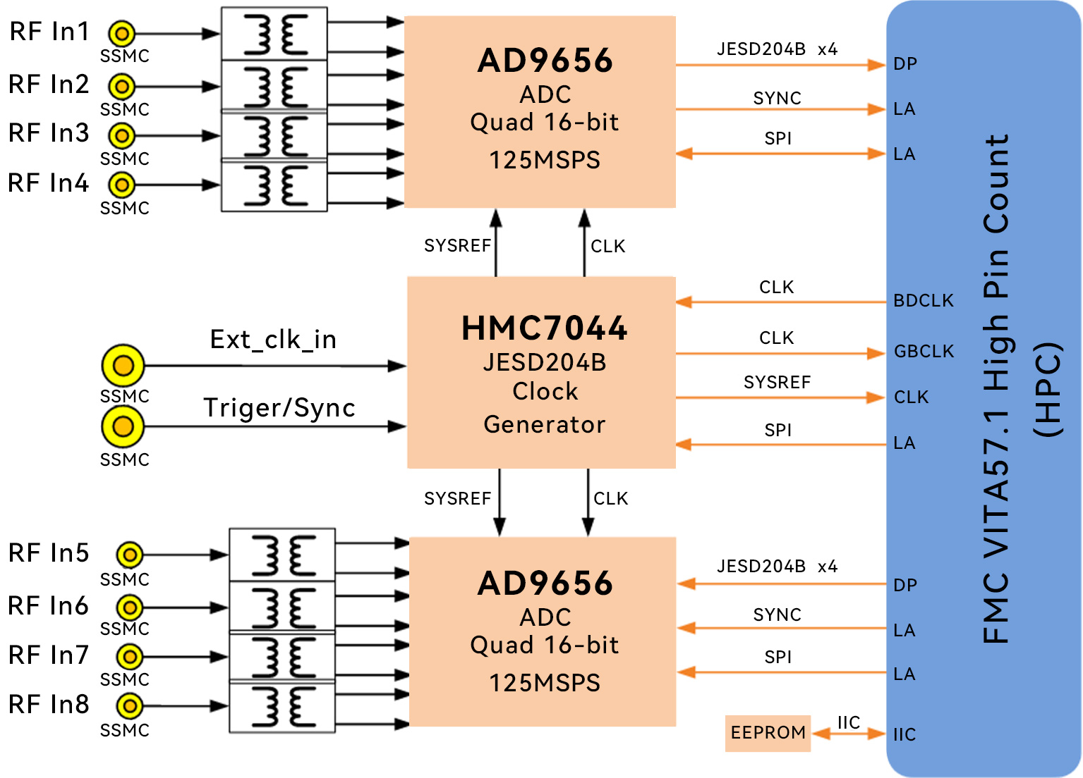 The FH9656 is a VITA57.1-compliant 8-channel 16-bit AD acquisition FMC card with 125 MSPS sampling rate. It features high-bandwidth FPGA connectivity via FMC-HPC for low-latency data transfer and supports multi-board synchronization. Ideal for radar, communications, and test measurement applications.