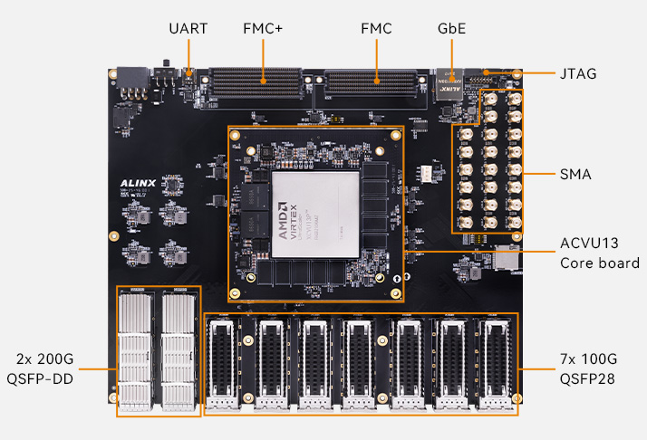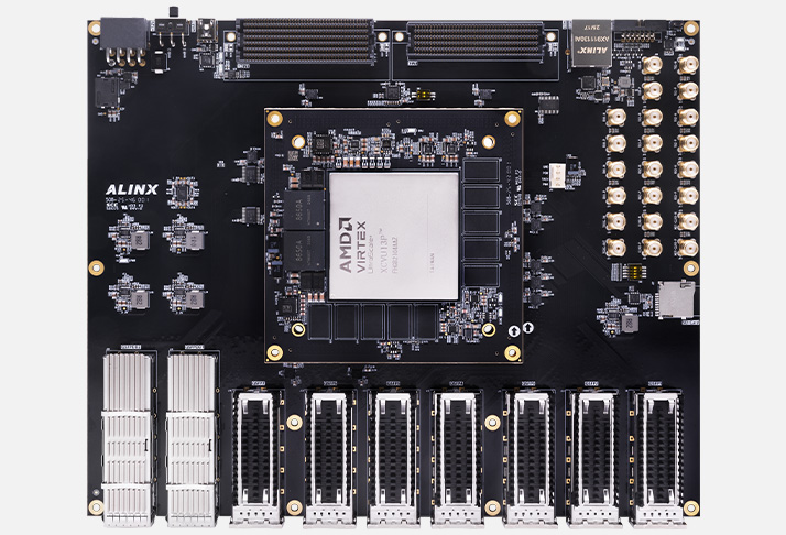 The AXVU13G is a professional-grade FPGA development platform centered on the Xilinx Virtex UltraScale+ XCVU13P FPGA, featuring extensive high-speed communication interfaces (including QSFP-DD and QSFP28), expansion capabilities (via FMC+ and FMC), and debug interfaces, designed for high-bandwidth data processing and complex algorithm acceleration